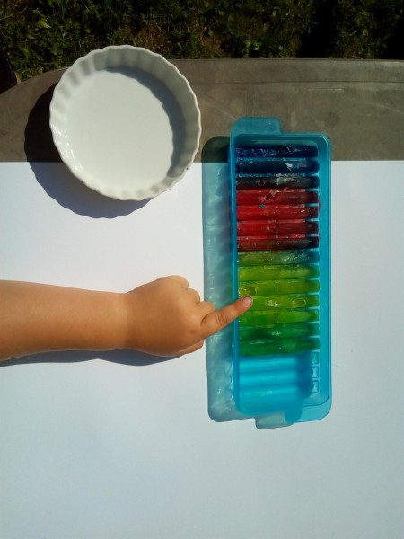 De la peinture dans le bac à glaçon, j’ai laissé congeler un peu avant de mettre de petits bâtonnets à l’intérieur. Très agréable comme technique de peinture et joli rendu !