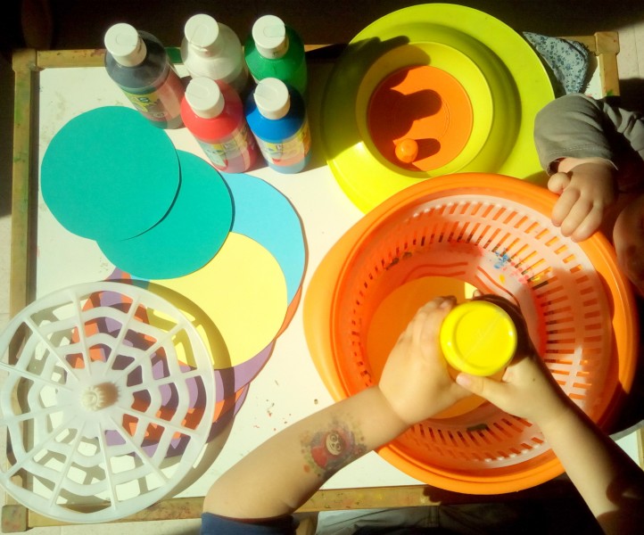 Chouette activité, permettant de nommer et jouer avec les couleurs et avoir de jolis visuels. Puis voir l’effet centrifuge sur la peinture et le résultat produit fût étonnant pour les enfants. Ils ont de plus bien fait travailler leurs petits muscles, en pressant les tubes de peinture, mais surtout en tournant l’essoreuse à salade ! Pas si simple, mais très amusant !