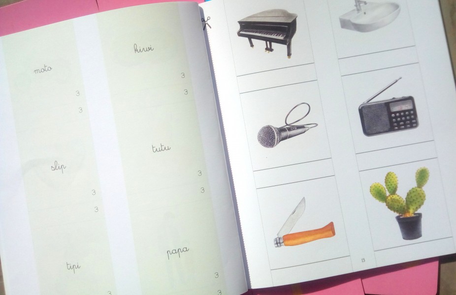 Dans l’idéal, ce cahier est recommandé pour les enfants, qui connaissent le son de lettres. Ou qui composent des mots grâce à l’alphabet mobile. Ou qui sont très intéressés par les mots qu’ils voient autour d’eux.