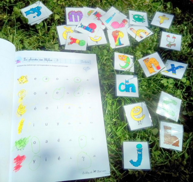 En jouant avec lui, je racontais l’histoire ( les caractéristiques) de chaque alphas et leurs chants ( leurs sons). Il a beaucoup joué à associer les alphas au poster. Puis aux petites cartes que je lui ai imprimé, colorié et plastifié.