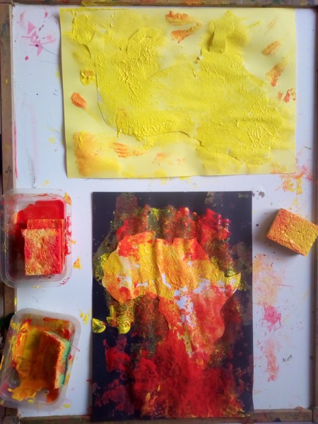Fond fait à l’éponge et collage des formes prédécoupées: