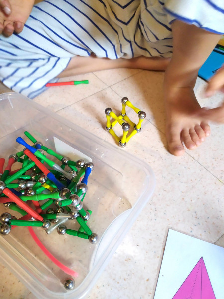 Les géomags ( billes et bâtonnets aimantés nous ont bien servi aussi pour fabriquer à nouveau nos solides, le côté aimanté accentue un peu la difficulté mais, ils ont recommencé ce jeu énormément de fois.