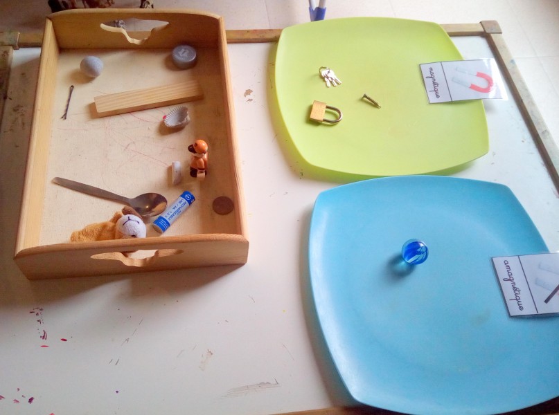 J’ai pensé faire cet atelier en deux temps, le concret avec la manipulation et l’abstrait ensuite sur papier. nous avons enchaîné les deux car Ulysse était demandeur. Plateau Montessori Expérience : Magnétique / Amagnétique