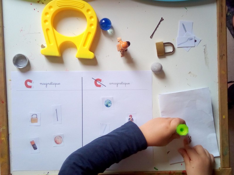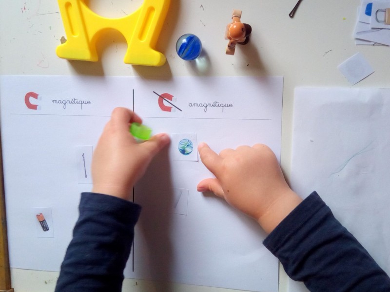 Je lui ai montré avec un objet, puis il a pris la suite avec un réel plaisir en classant chaque objet dans les bons plateaux. Nous nommons à chaque fois leur statut : magnétique ou amagnétique.